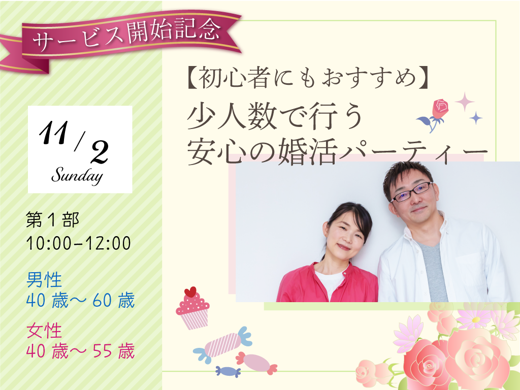 申込み締め切り本日(10/30)まで!【初心者にもおすすめ】少人数で行う安心の婚活パーティー 第1部【女性先着5名まで1500円⇒500円】
