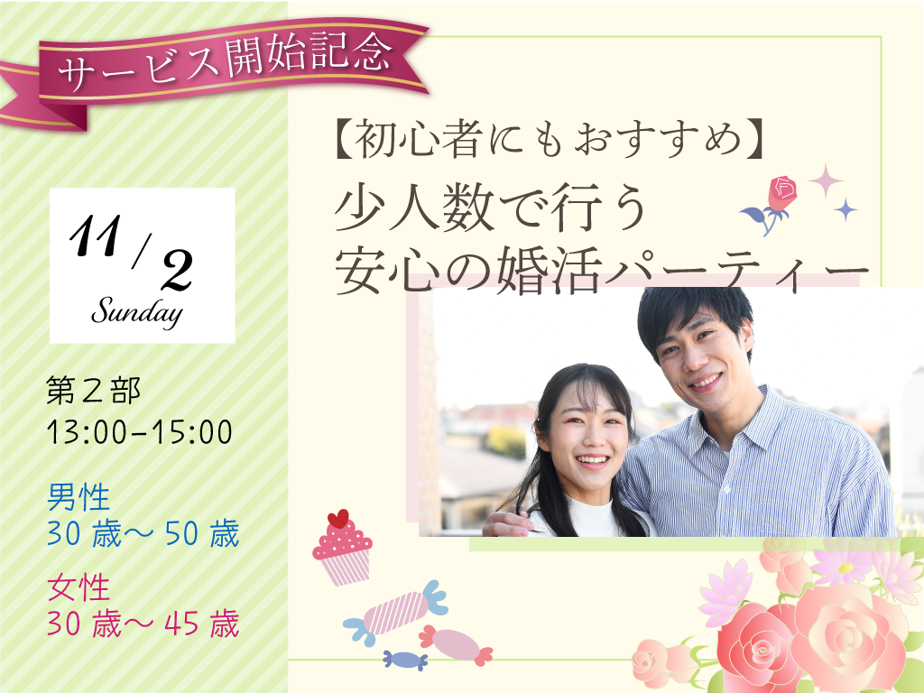 申込み締め切り本日(10/30)まで!【初心者にもおすすめ】少人数で行う安心の婚活パーティー 第2部【女性先着5名まで1500円⇒500円】