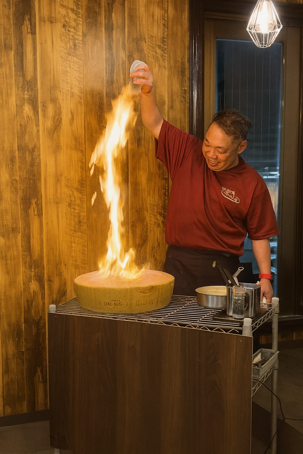 有名な炎のチーズリゾットもぜひ、ご覧ください!
