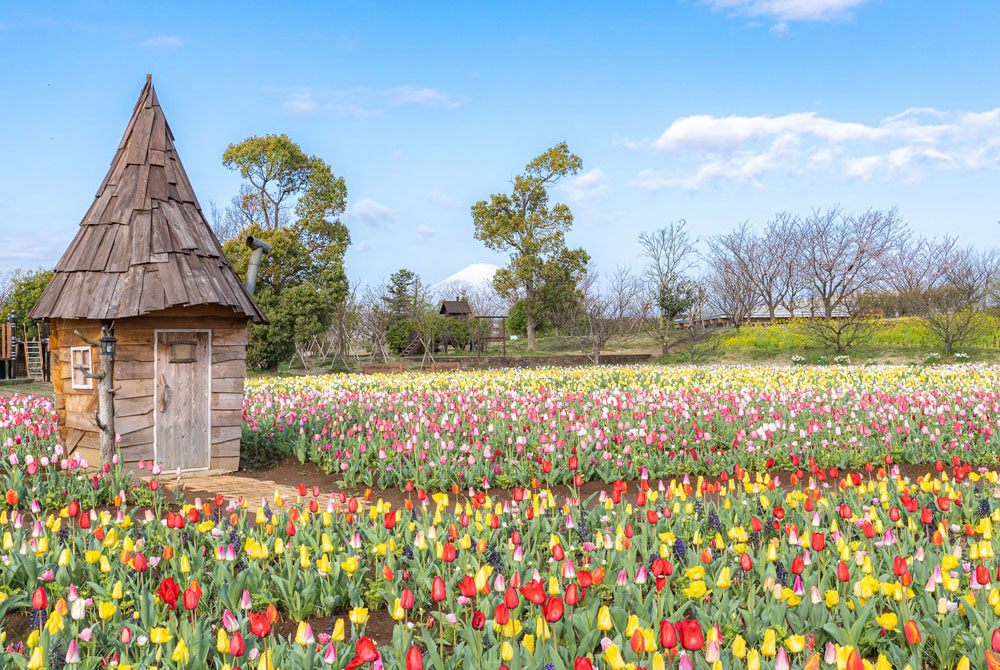 色とりどりのチューリップや春のお花が咲き誇る